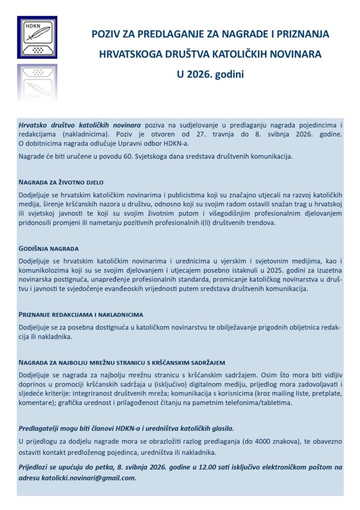 Hrvatsko društvo katoličkih novinara poziva na sudjelovanje u predlaganju nagrada pojedincima i redakcijama (nakladnicima). Poziv je otvoren od 27. travnja do 8. svibnja 2026. godine.